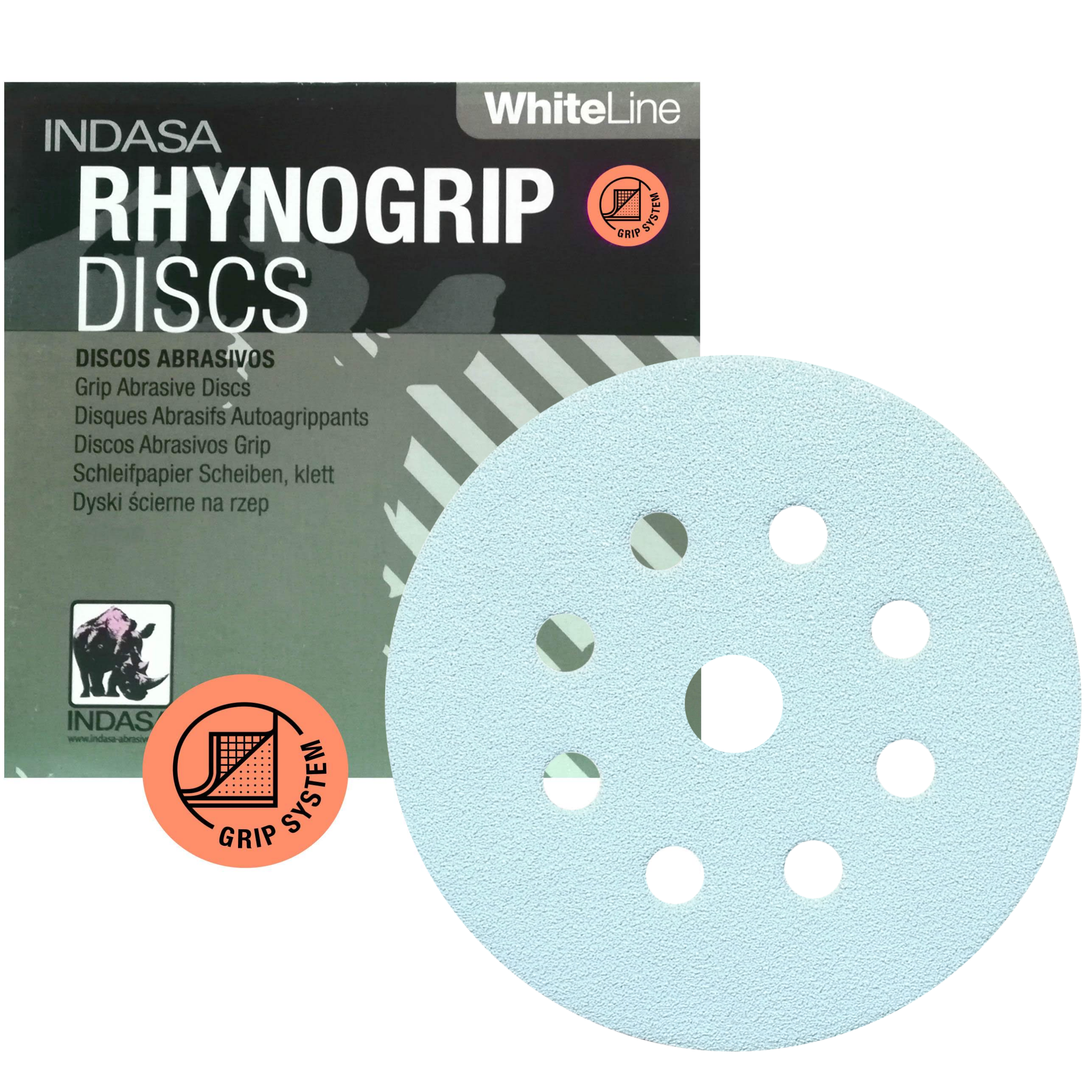 Krążki ścierne na rzep INDASA Rhynogrip White Line 8-mio otworowe (+ jeden otwór centralny) o średnicy 125 mm przeznaczone są zarówno do szlifierek mimośrodowych, orbitalnych, kątowych jak i do szlifowania ręcznego na sucho.