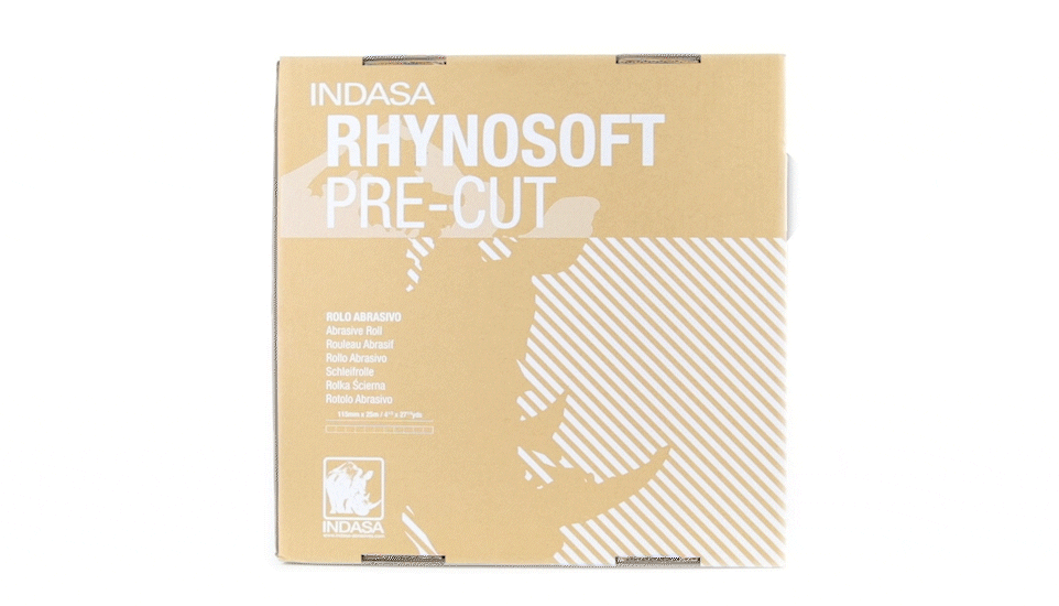 Papier ścierny na gąbce w rolce INDASA Rhynosoft PRE-CUT 115 mm x 25 m na elastycznym podłożu, do szlifowania trudno dostępnych miejsc, krzywizn oraz powierzchni zarówno gładkich jak i profilowanych przed lakierowaniem lub polerowaniem. Wstępnie nacięty (perforowany) na formatki.